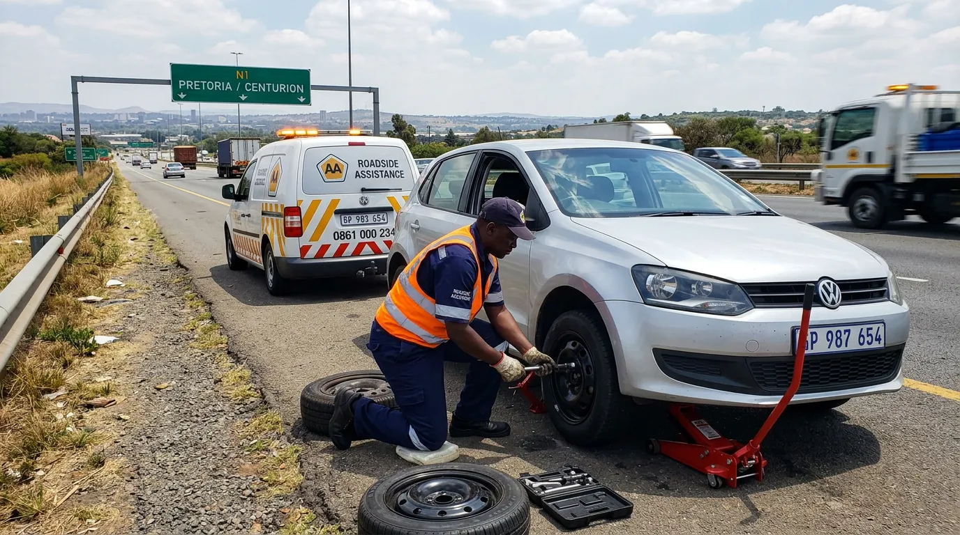 Flat tyres are one of the most common calls to our Pretoria roadside assistance team — we'll have your spare fitted and you back on the road in under 20 minutes.